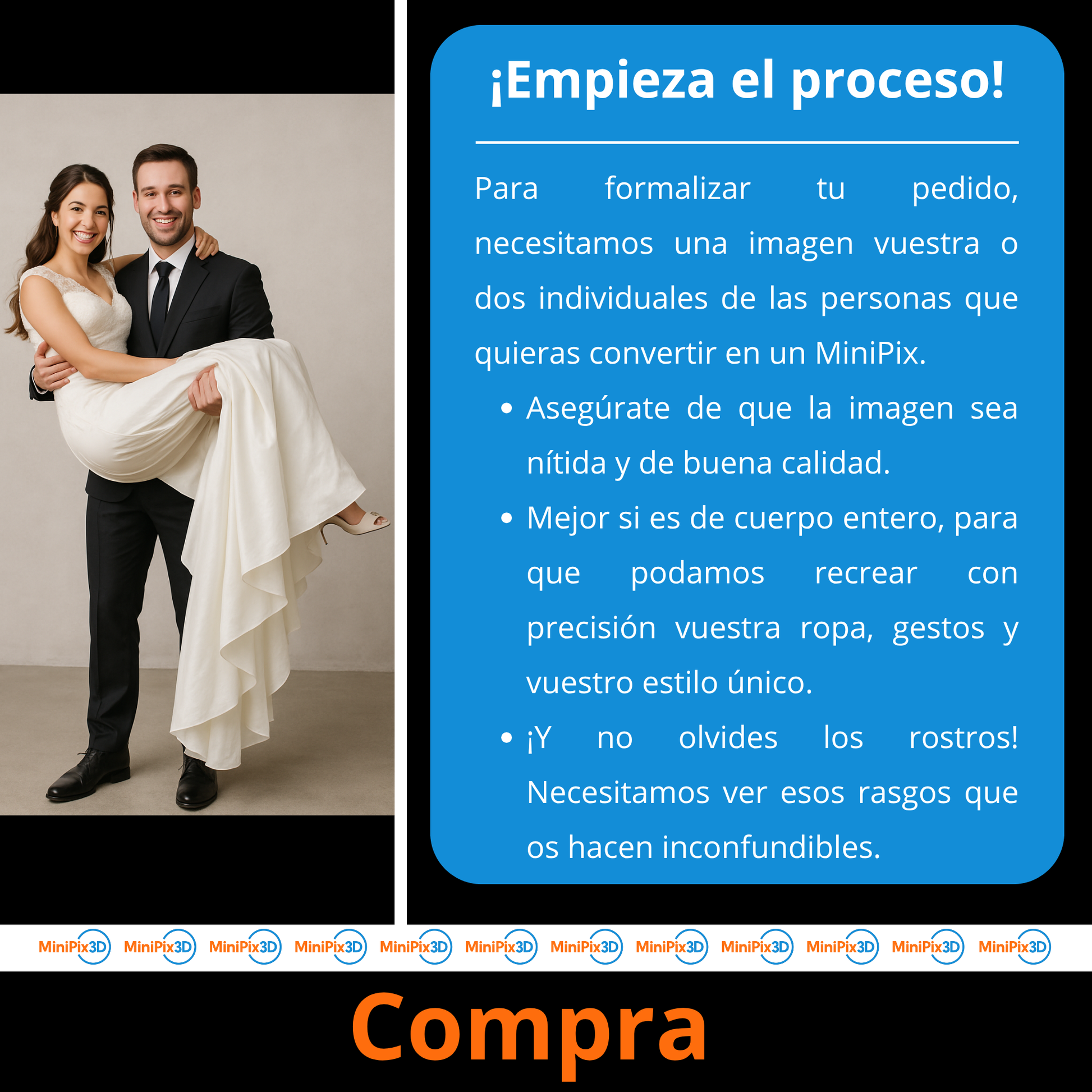 Este pack os ofrece la misma figura doble detallada que en nuestro MiniPix Dúo, pero con un giro emocionante: ¡la entregamos lista para que la pintéis! Simplemente subid vuestras fotos de cuerpo completo al realizar la compra, y nosotros nos encargaremos de la magia del diseño 3D. Recibiréis vuestra figura MiniPix Dúo en blanco, junto con todo lo necesario para transformarla en una auténtica obra de arte colaborativa.